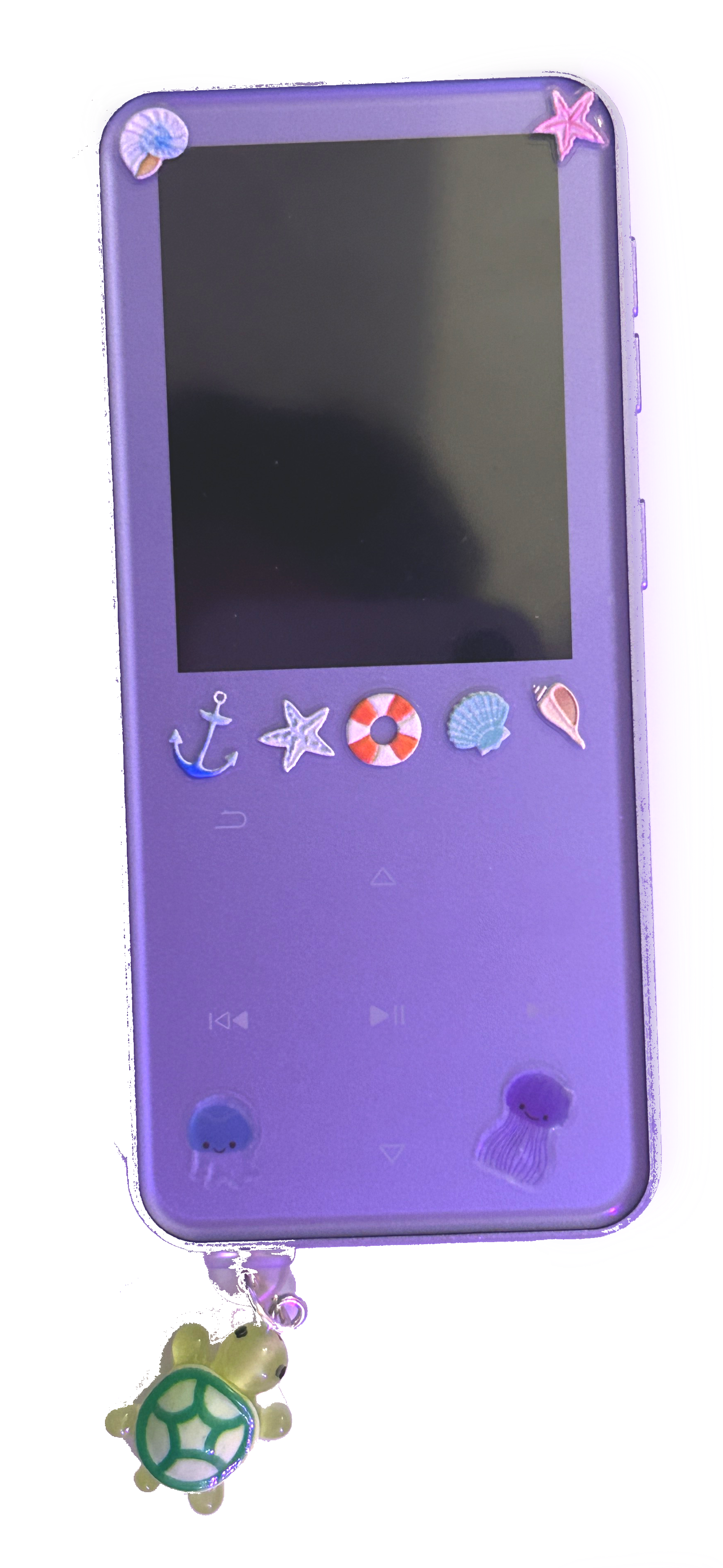 now with this particular player, I do think you get a lot of bang for your buck. There's a lot of these cheap random MP3 players being made now and it's hard to figure out which ones are actually usable. And while this one is a bit clunky UI wise,it does do what I want to do and it's very sturdy. The sides are metal and the front and back is glass. The front buttons sometimes take a few taps to register, but honestly so does my phone sometimes so I can't really fault it for that. The battery life is good and I like that it completely turns off between uses to save battery life and also the storage is great, I like that you can use a microSD card with it.I mostly use this as a podcast machine because then I can do my little tasks while listening to something without being tethered to my phone. You can make playlists, I don't know why a lot of the reviews say that you can't, but you definitely can. I like that I can shuffle through a massive amount of songs and podcasts, I use it when I am paralyzed by choice and I basically just let it pick for me and that works really well. I also like that it has a headphone jack! I'm still salty that apple and also a lot of other phones decided that headphone jacks weren't necessary anymore. my Bluetooth ones always die way too soon and then I'm left without background noise.>:(this one actually does have Bluetooth capability, but I haven't tried it yet, I usually just use wired headphones with it. I customized this one too. (obviously) I got a little turtle charm that's attached to a dust plug. (I've been really into turtles lately. I just think they're neat) and I got some textured nail stickers which very much adds to the vibe. For the price, I really like it. People spend crazy amounts of money on music players, but I just didn't want to drop that much and I'm happy with this one.