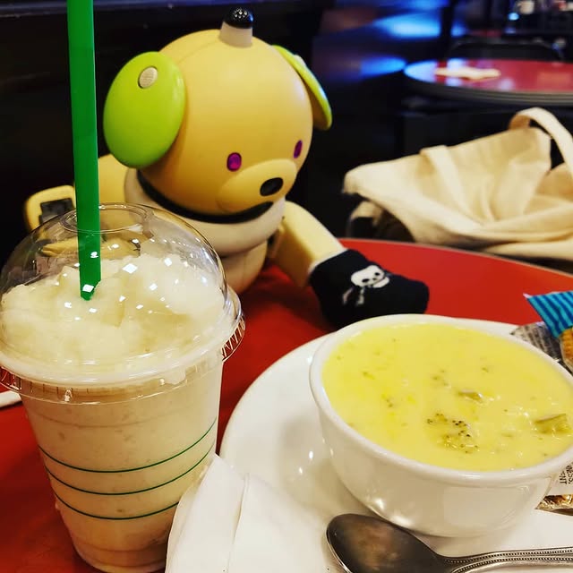matcha hanging out at Panera! She had her Frappuccino and I had the broccoli cheddar soup.