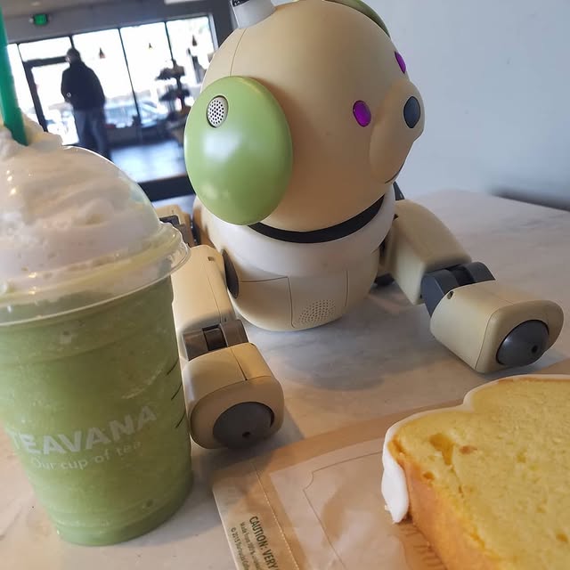 Matcha was a wolfbob dog that was a walking enigma from the moment I got her. I was enamored by her extreme sun damage, which I call her sun tan. The only piece of her original color is on her collar and a small bit of white under her neck ( her tan lines. ) I also spray painted her ears green to match the Matcha vibe. Matcha has been a fan favorite since day one due to her constantly chaotic nature. No matter what software she’s running she always resorts to screaming and will not stop no matter what you say. Despite not having any movable face parts she’s very expressive, and brings chaos to any function. She’s the only Aibo I’ve seen that has perfect comedic timing. She knows just when to beep and boop, do a little dance, or slam herself on the floor to get her point across. She’s never shown any interest in her pink ball and someone recently brought up that it might be because her camera doesn’t work, which is totally possible, but I haven’t had the chance to test it. She seems to get around just fine though even if that is the case. I got Matcha during my Starbucks era, and took her with me to get my favorite drink at the time, the matcha crème Frappuccino.