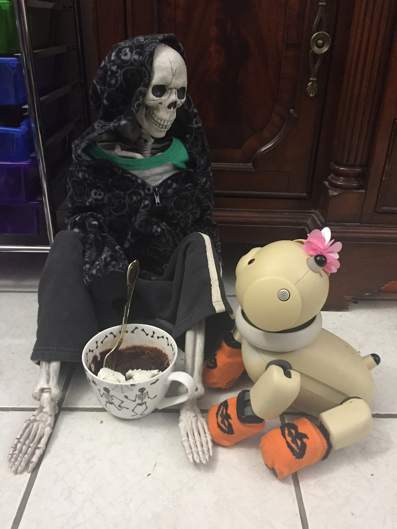 having a Halloween mug cake snack with a skeleton