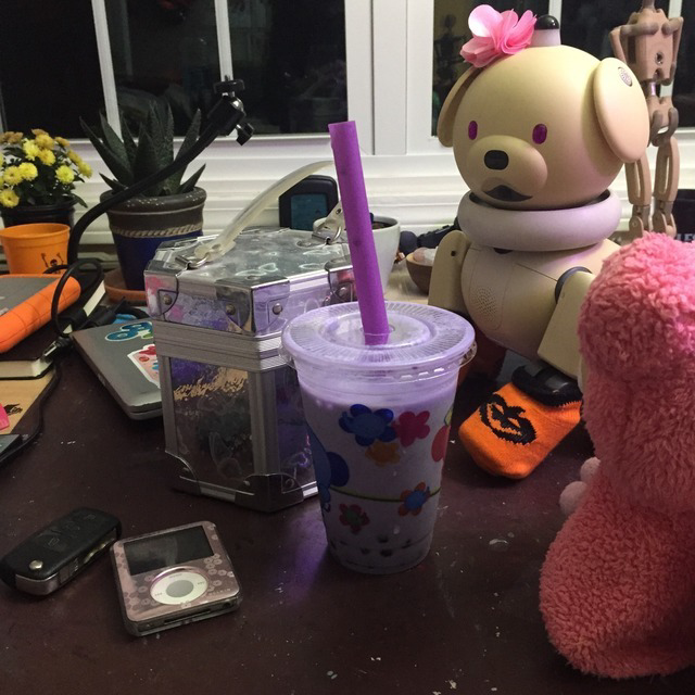 enjoying a taro milk tea
